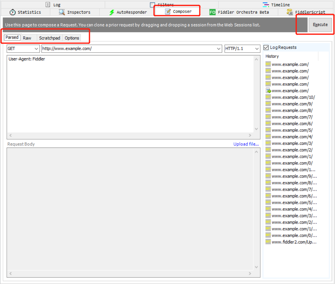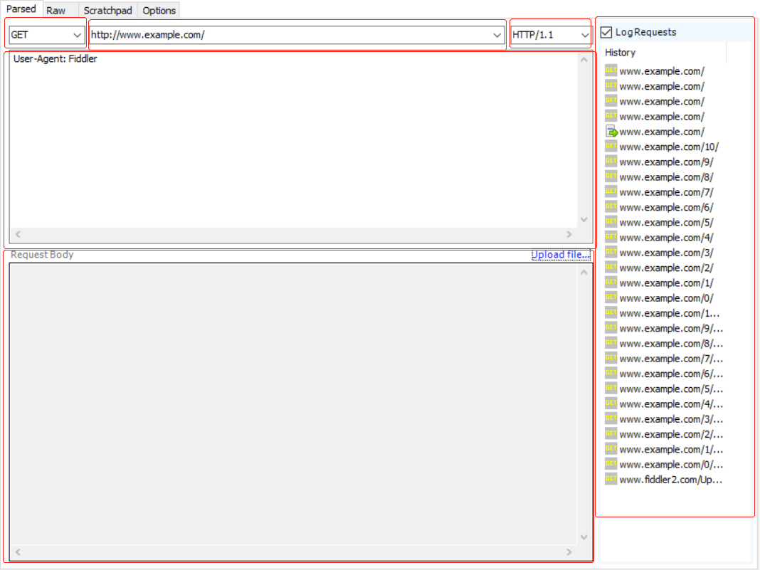 fiddler的左边tab栏中有一个”Composer”栏。正如它的名字意思:”作曲家”,我们在Composer中发送请求。点开Composer栏,它的界面组成如下图:
