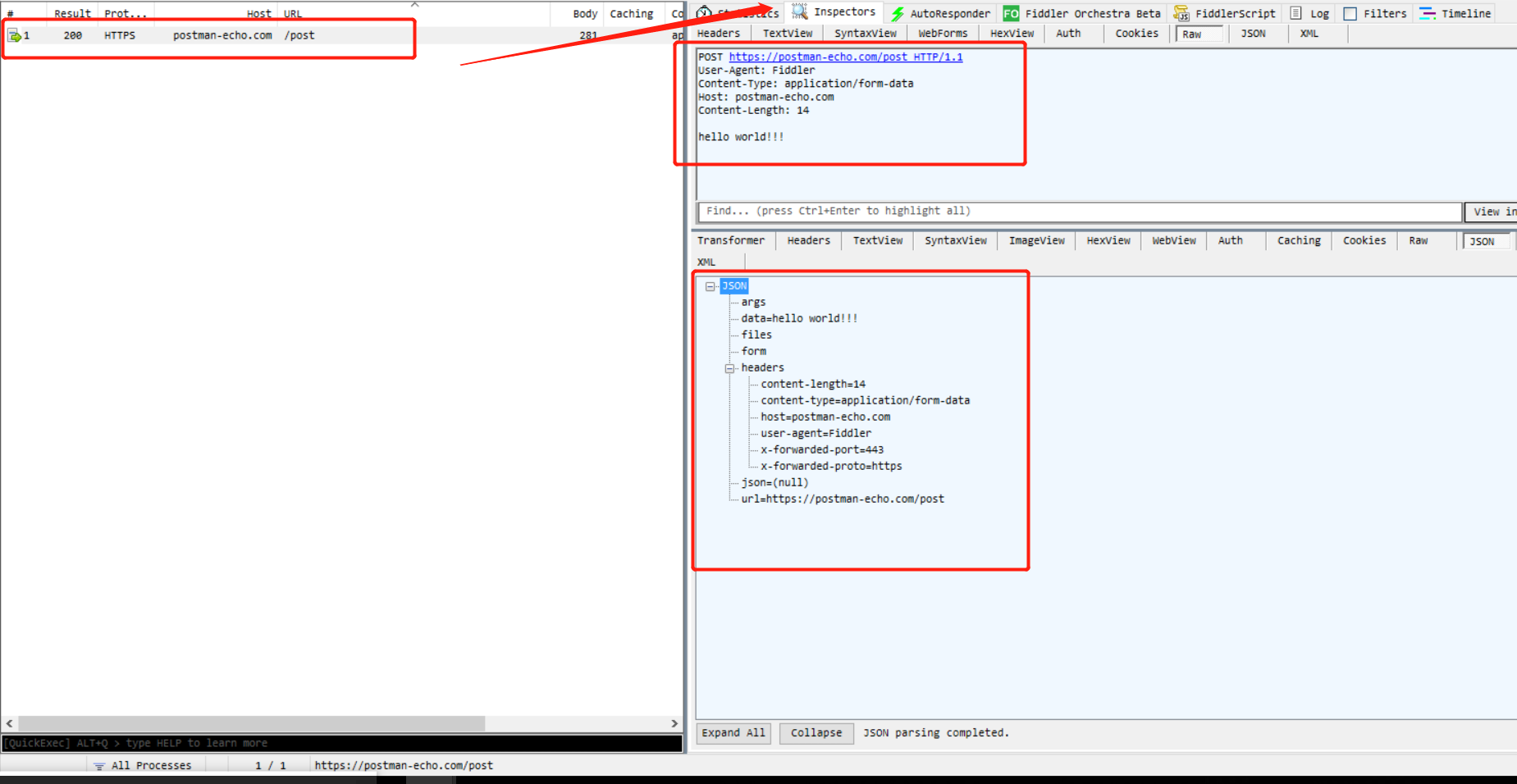 结果是运行成功。可以在session list中看到我们发送了一条请求,在inspectors中查看详情: