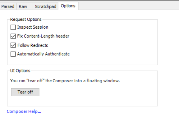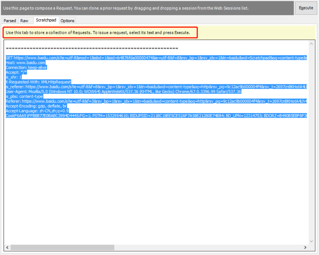 它有一个Execute按钮,当我们写好http请求后,点击按钮就可以发送请求了。不过先不急,我们先介绍它的4个tab栏:Parsed、Raw、Scratchpad、Options